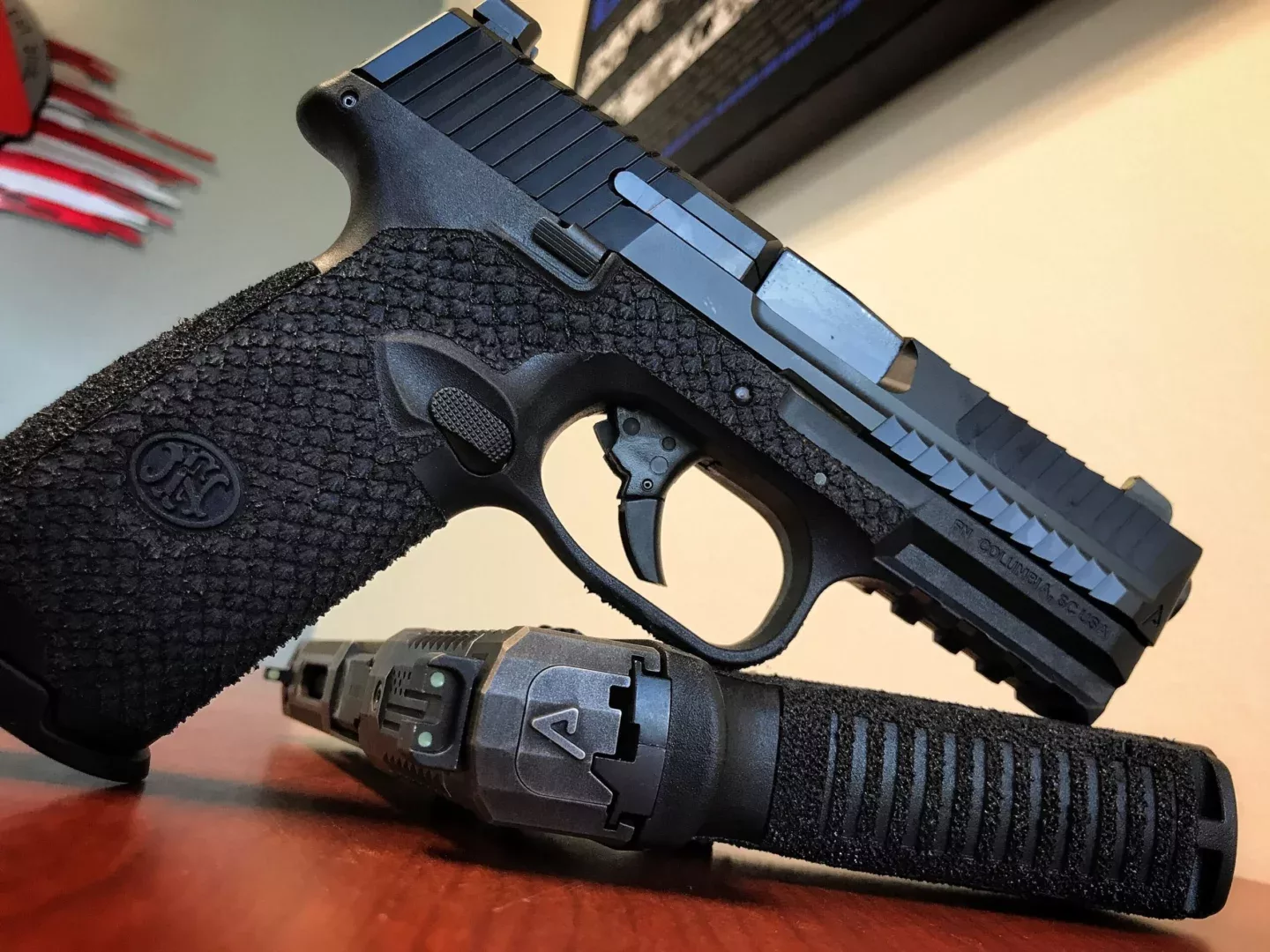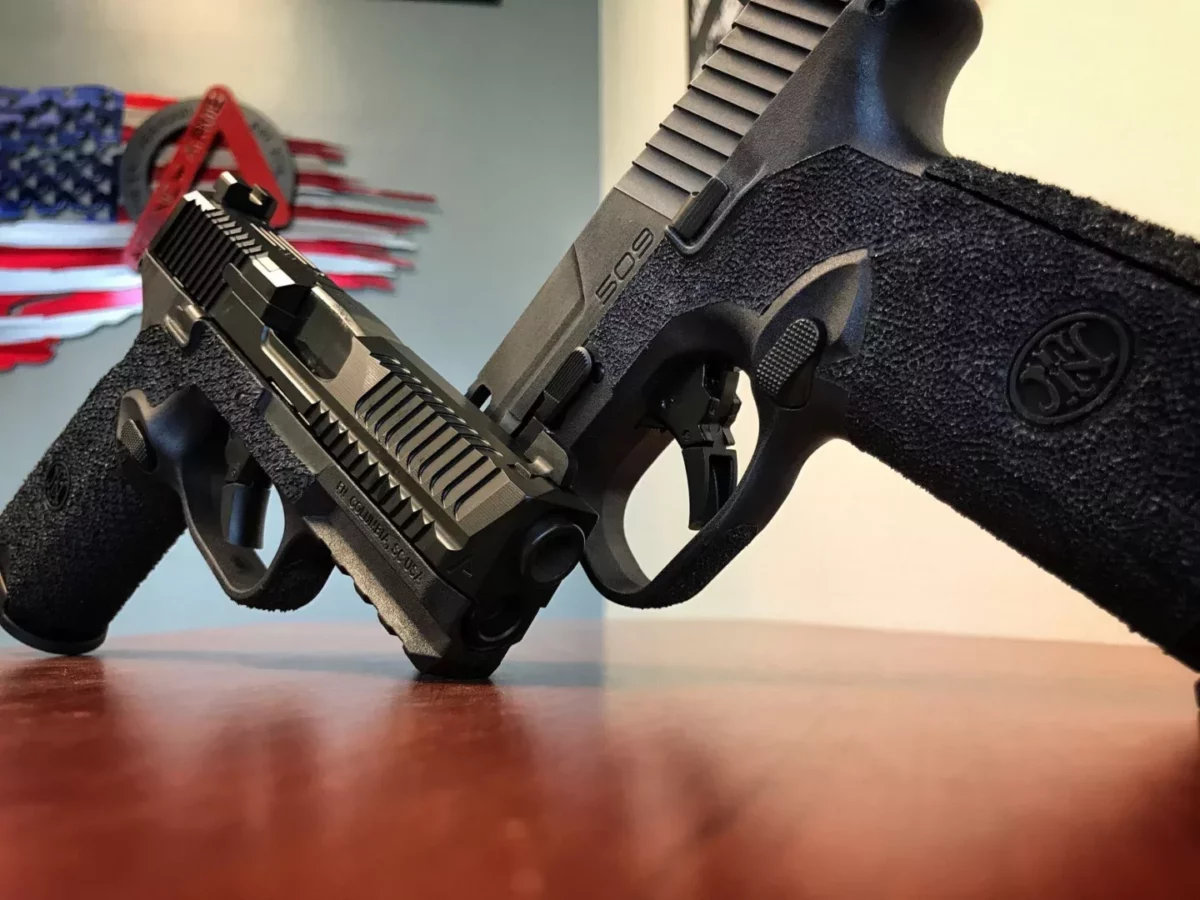 As a standard upgrade we perform the aftermarket ACCELERATOR CUTâ„¢ frame service. The Accelerator Cutâ„¢ service offers enhanced traction on the pistol. After the Accelerator Cutâ„¢ service is performed, muzzle rise is dramatically decreased and follow up shots are faster. We also perform a Trigger guard undercut and finish it off with a full body stipple.